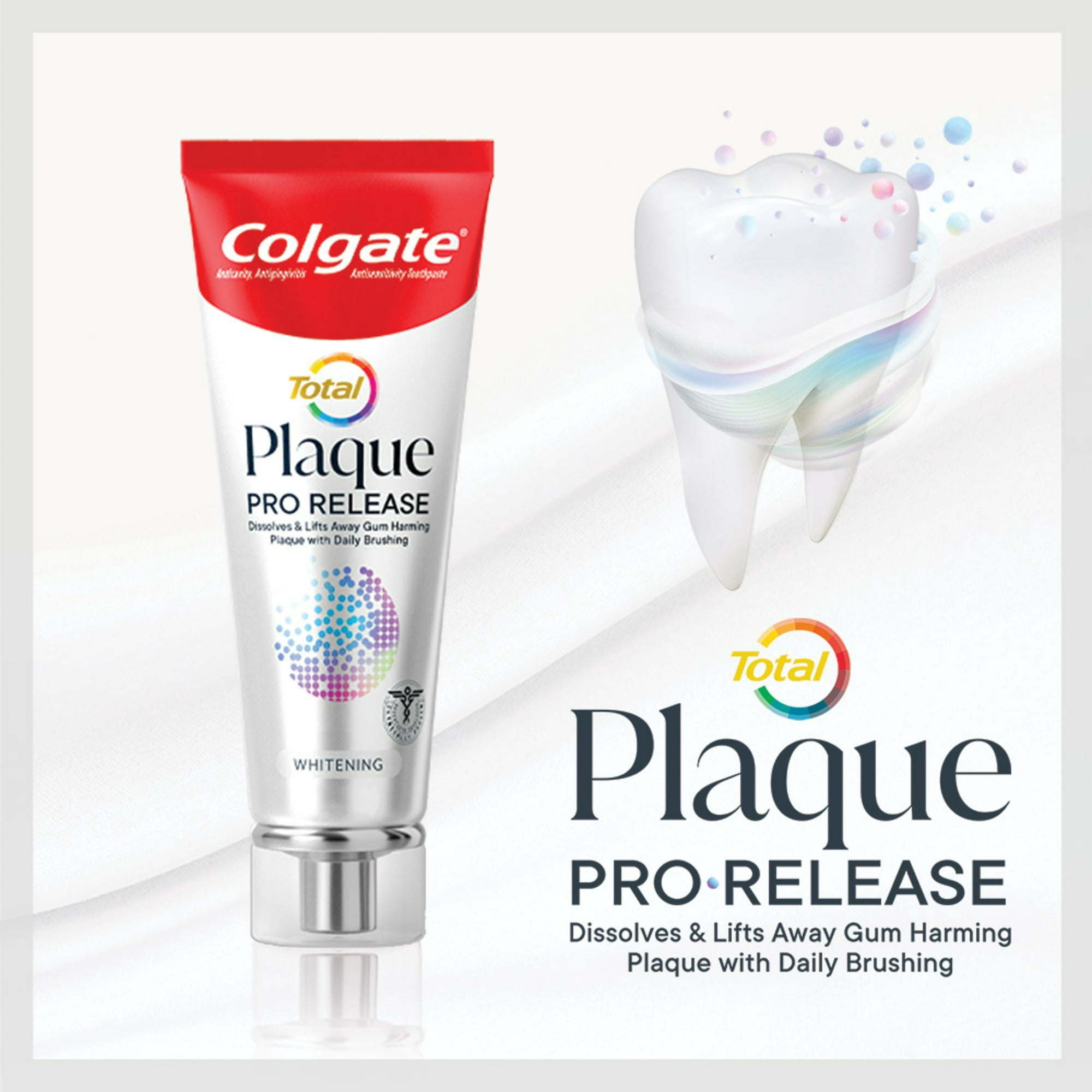 Dissolve and lift away gum harming plaque bacteria with daily brushing using Colgate Total Plaque Pro Release Whitening Toothpaste