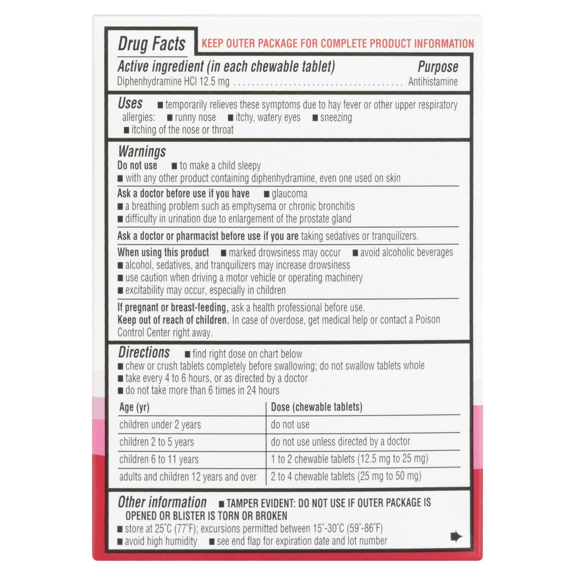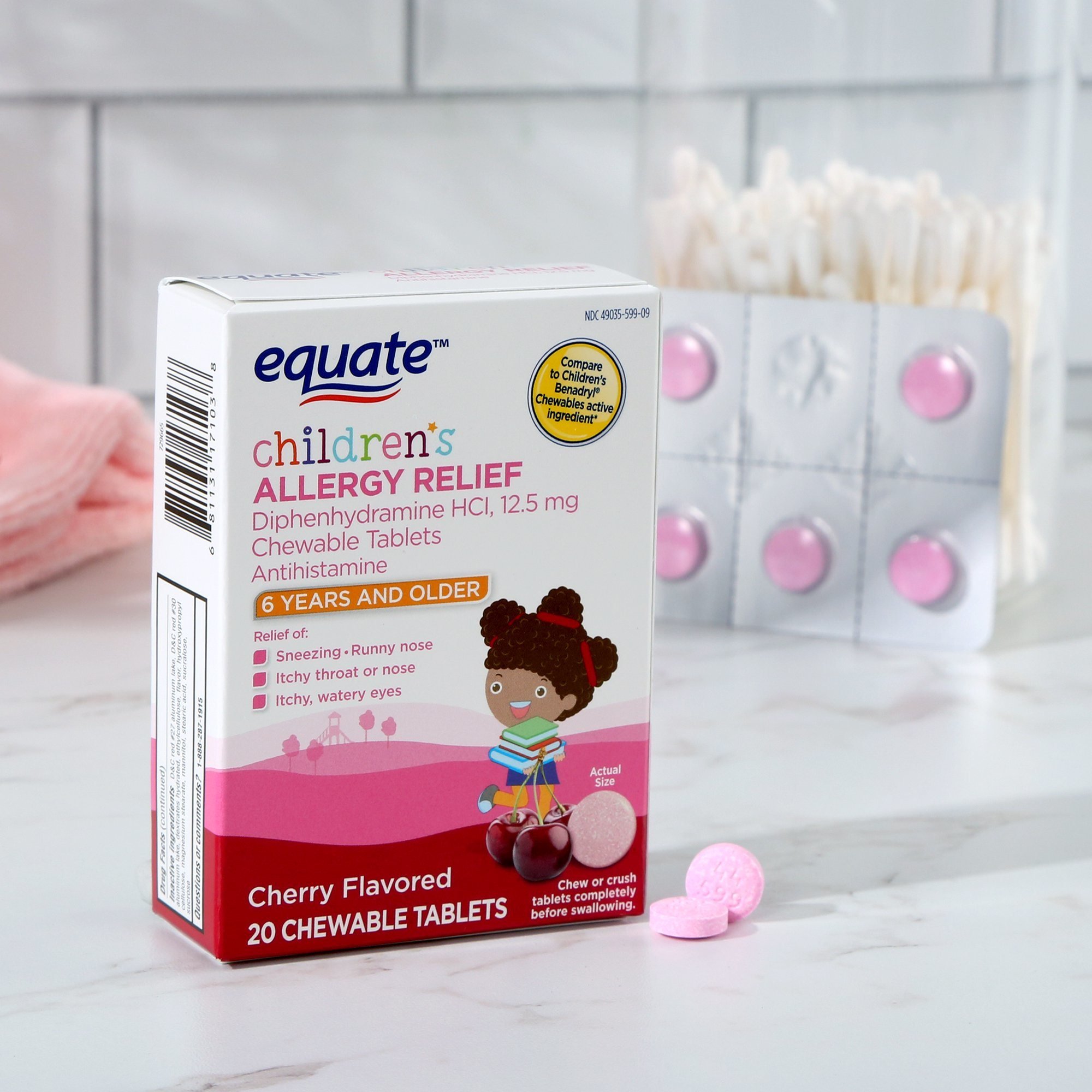 Help your child get rid of sneezing; scratchy throat; and itchy; watery eyes with Equate Children's Cherry Flavored Allergy Relief Chewable Tablets. Whether your little ones suffer from seasonal allergies or are experiencing a mild allergic reaction; our allergy relief chewable tablets alleviate symptoms and help them get back to their day. Our formula contains the active ingredient diphenhydramine HCI; an antihistamine that works to prevent the effects of histamine in the body. The suggested dose is 1-2 chewable tablets for children 6-11 years of age and 2-4 tablets for children ages 12 and older every four to six hours. Do not take these tablets more than six times in 24-hours. When your child starts experiencing allergy symptoms; stop reaching for more boxes of tissues and start reaching for Equate Children's Cherry Flavored Allergy Relief Chewable Tablets.