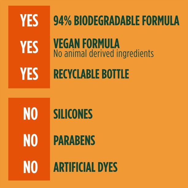 no silicones; no parabens; no artificial colorants; in a recyclable bottle; formula is vegan; 94 percent biodegradable formula and suitable for color treated hair