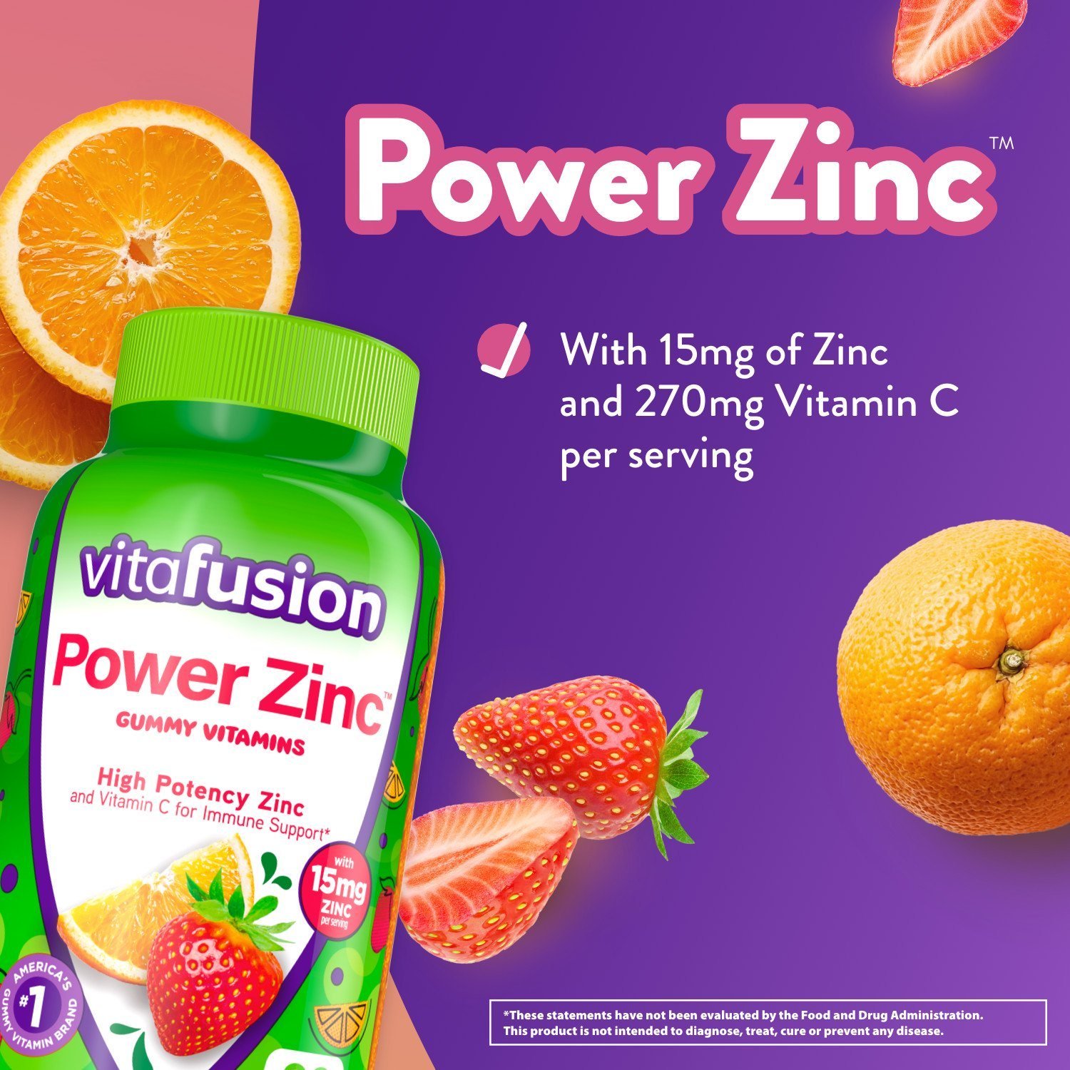 Includes: One 90 ct bottle of vitafusion Power Zinc Gummy Vitamins; Strawberry Tangerine Flavored Immune Support Vitamins with Zinc and Vitamin C for powerful immune support (1)